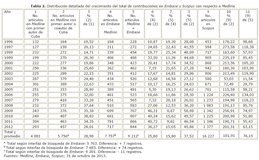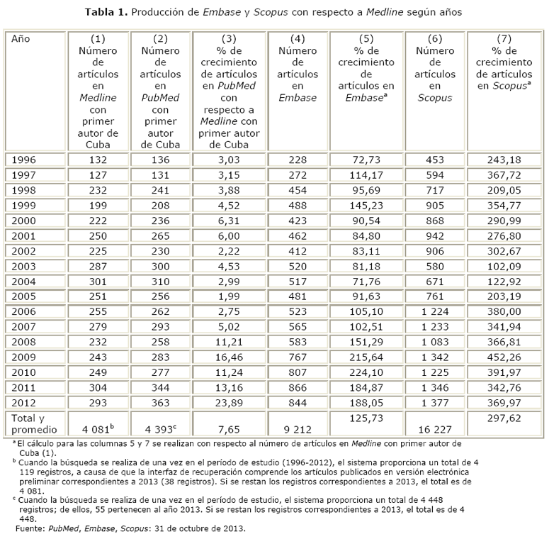 b Como se refirió antes, Medline y PubMed no ofrecen información con respecto a la afiliación de los coautores de los artículos procesados en sus colecciones. Sin embargo, como Embase procesa el ciento por ciento de los registros procesados por Medline y su registro bibliográfico sí contiene las afiliaciones de los autores, entonces desde Embase es posible conocer cuántos son los artículos de autores cubanos existentes en la colección de Medline que presentan entre sus coautores un profesional que labora en una institución de la isla.