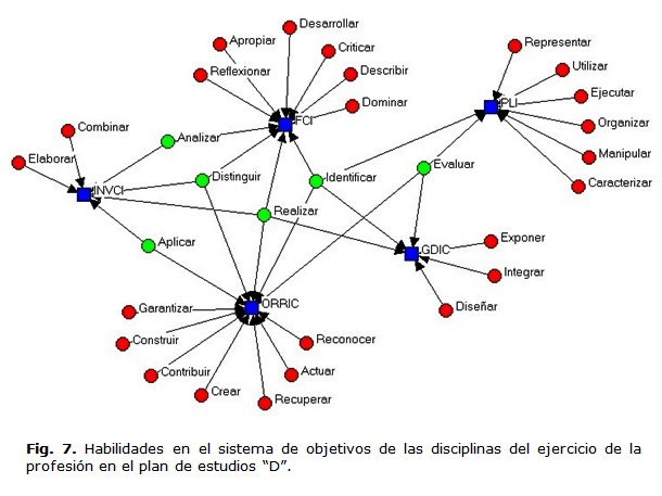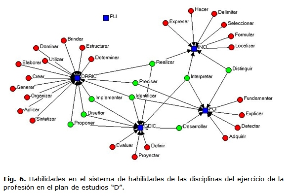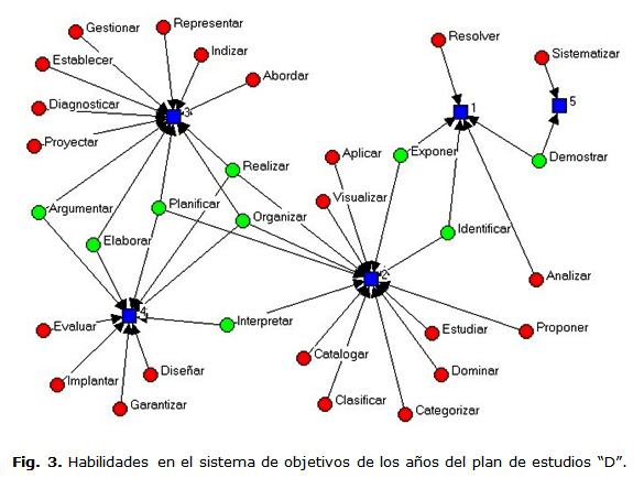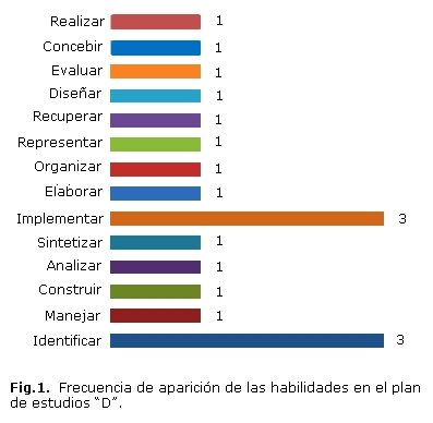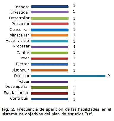 En los objetivos generales y el sistema de habilidades de la carrera estuvieron implícitas las habilidades genéricas y específicas sin distinción unas de otras. En ambas declaraciones coincidieron los siguientes infinitivos contextualizados de manera diferente: analizar, aplicar, diseñar, dominar, elaborar, evaluar, exponer, garantizar, identificar, organizar y representar (Fig. 1 y 2).