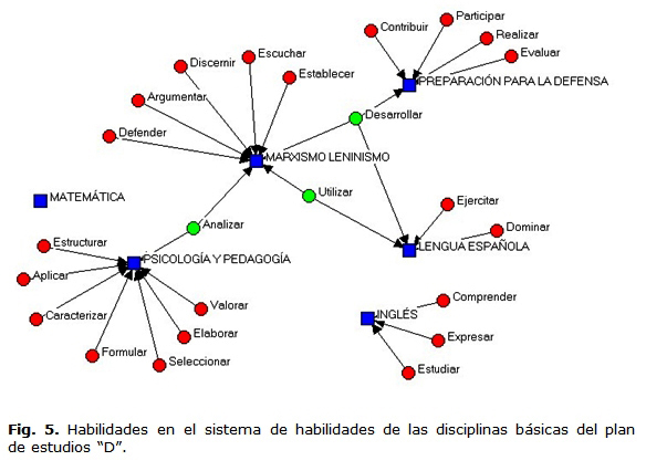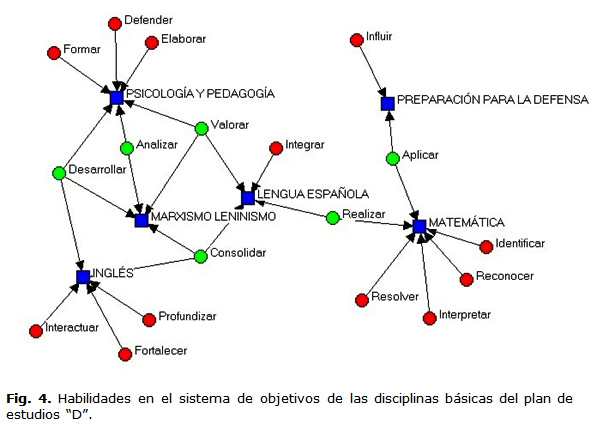 En las figuras 4 y 5 se identifican una serie de infinitivos que se expresan en el sistema de objetivos y habilidades de las siguientes disciplinas de formación general de la Licenciatura: Marxismo-Leninismo, Lengua Española, Idioma Inglés, Preparación para la Defensa, Matemática, Pedagogía y Psicología. La presencia de habilidades comunicativas se corresponde con la declaración de los objetivos y sus habilidades en correspondencia con los contenidos de las disciplinas.