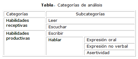 Las categorías corresponden a la clasificación de habilidades comunicativas (tabla).