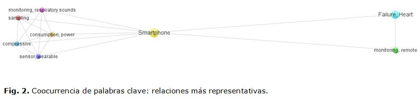 Agrupados en 8 clusters diferenciados por el color de los nodos, se corrobora el comportamiento detectado hasta el momento. Los elementos identificados como más prominentes del campo, al menos desde la perspectiva temática, se corresponden con los grupos inherentes a la Biomedicina "clásica" donde la Cardiología resulta la más activa teniendo en cuenta las principales causas de muerte relacionadas con ella; solo que ahora incluyen aspectos de telecomunicación vía tecnología móvil en respuesta a la necesidad de dar un seguimiento óptimo de los pacientes, labor bien intensa. Por otro lado, la identificación del cluster Smartphone, como protagonista, corrobora su factibilidad como dispositivo capaz de combinar el uso del ancho de banda, el relativo bajo costo computacional y de telecomunicaciones, así como la posibilidad de contar con la presencia de una computadora cerca del cuerpo de cada paciente. En ese sentido se solventan de manera conjunta necesidades técnicas relacionadas con la adquisición de datos fisiológicos, procesamiento local, así como la ubicación y comunicación de los datos de forma inmediata.