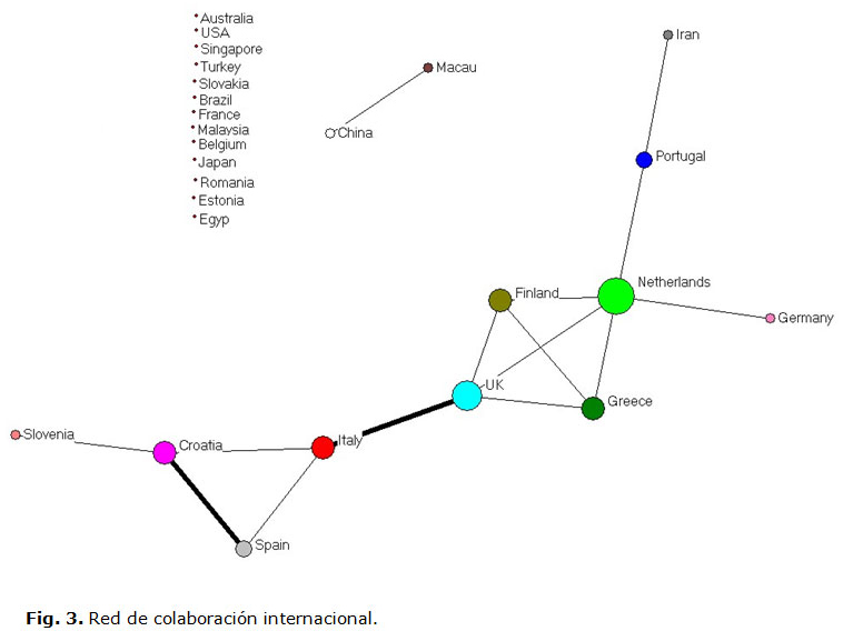 Reino Unido, Finlandia, Holanda y Grecia son los países con los que se colabora en mayor medida. Reino Unido y Holanda son los países mejor conectados. Cuentan con una posición central muy ventajosa dentro de la red, dada por el número de relaciones, el nivel de accesibilidad, el prestigio y la existencia de una posición estructural ventajosa al tener la posibilidad de encontrarse entre dos o más actores.