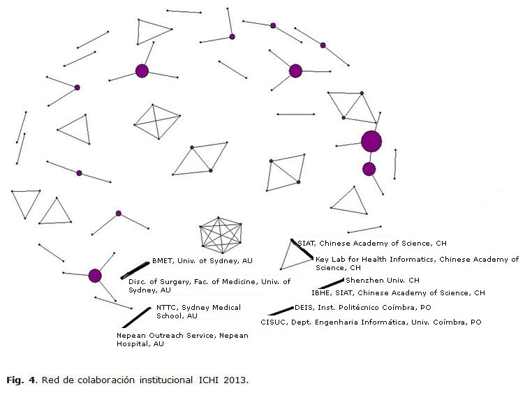 El abordaje de la producción científica de la Primera Conferencia sobre Informática de la Salud, ICHI' 2013, permitió obtener referentes sobre los autores, instituciones y países más representativos por la cantidad de ponencias presentadas. Se identificaron también los niveles de colaboración científica, así como la relación temática a partir de la coocurrencia de palabras clave. Todos estos elementos constituyen una primera aproximación desde una perspectiva descriptiva.