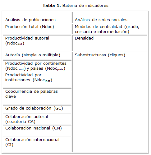 El análisis documental clásico en correspondencia con la investigación documental para la revisión de la literatura, así como las técnicas de visualización basadas en análisis de redes sociales para la representación del análisis de colaboración y la coocurrencia de palabras clave, fueron las técnicas principalmente utilizadas para la realización de la presente contribución. La batería de indicadores utilizados (simples, relacionales y de redes sociales) se corresponde con los mostrados en la tabla 1.