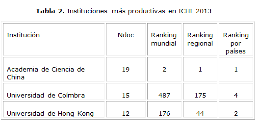 A nivel institucional las universidades, los centros de investigación y los hospitales ejercieron una fuerte influencia en el evento. Las instituciones más representadas resultaron ser la Chinese Academy of Science, la University of Coimbra y la Chinese University of Hong Kong. En la tabla 2 se listan primeramente de acuerdo con el número de ponencias firmadas, y luego aparece el lugar que ocupan en el Scimago Institutional Ranking (SIR) 2013 (4), que presenta el grupo de investigación Scimago de España, a partir de datos contemplados en la base de datos Scopus en el período 2007-2011. Se presenta la ubicación en el ranking mundial (WR), regional (RR) y a nivel de país (CR).