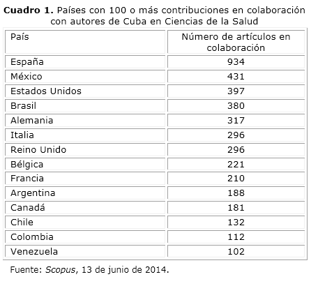 Los autores de instituciones españolas, por ejemplo, firmaron 934 del total de los artículos identificados en Scopus en Ciencias de la salud, realizados por autores de Cuba. Esta cifra ubica a España en el primer lugar entre los países que han colaborado con Cuba en el período 1996-2012 en el desarrollo de investigaciones en cooperación (cuadro 1). Un total de 14 países poseen 100 o más contribuciones realizadas en colectivo con autores de instituciones de Cuba.