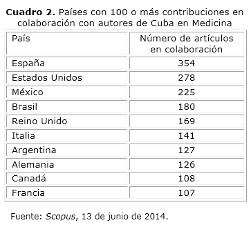 Como sucedió con Ciencias de la salud, en Medicina, el país con el mayor número de artículos publicados con colaboración de autores de instituciones extranjeras es España, con 354 contribuciones. Un total de 10 países poseen 100 o más contribuciones realizadas en colectivo con autores de instituciones de Cuba (cuadro 2).