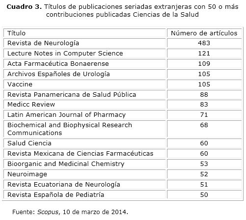 Se identificaron 15 títulos de publicaciones seriadas extranjeras con 50 o más contribuciones de autores cubanos publicadas en las Ciencias de la salud en el período analizado (cuadro 3). La Revista de Neurología (España) lidera la relación de títulos con una cifra que cuadriplica la serie que le sigue (Lecture Notes in Computer Science).