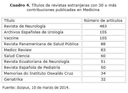 En Medicina se hallaron 10 títulos de revistas con 30 o más artículos de autores de instituciones nacionales publicados en cooperación con autores afiliados a organizaciones extranjeras (cuadro 4). La Revista de Neurología vuelve a encabezar la lista, como sucedió en Ciencias de la Salud.