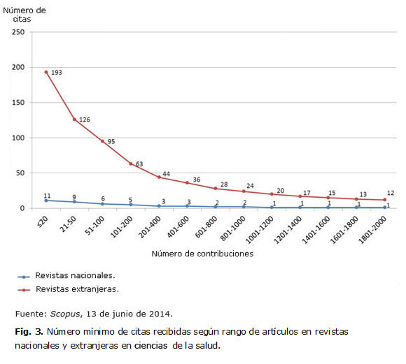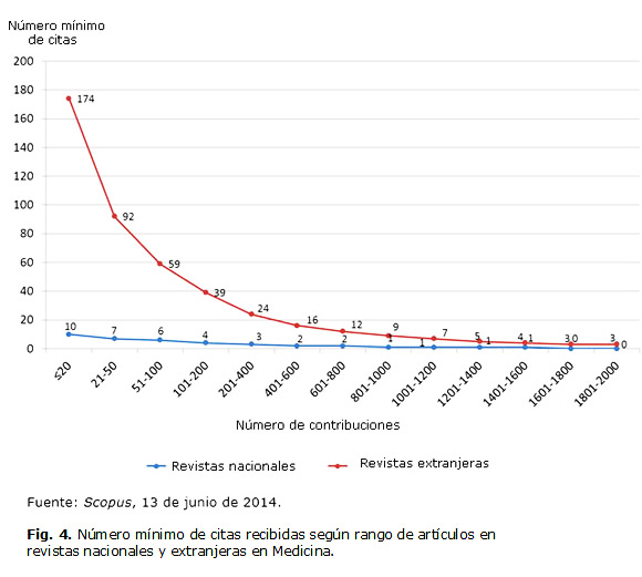 En Medicina, como promedio, el número mínimo de citas recibidas según rango es menor que el obtenido por las revistas nacionales y extranjeras en su conjunto en Ciencias de la salud; también, en ambos campos, se observa un acercamiento entre los índices mínimos de citas recibidas por las revistas nacionales y extranjeras, así como que los niveles de citación en revistas nacionales son inferiores con respecto a los que presentan sus homólogas extranjeras. Estas, son características comunes en el comportamiento de los niveles de citación en los países de América Latina con una infraestructura editorial propia en Scopus.4