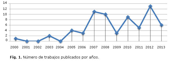 Productividad por años: la productividad según los años de publicación ha tomado un notable aumento a lo largo del período caracterizado (Fig. 1). Es evidente que durante los primeros seis años (2000-2006) ha existido un bajo índice de trabajos publicados. Fue a partir del 2007 cuando se incrementó la productividad temática.