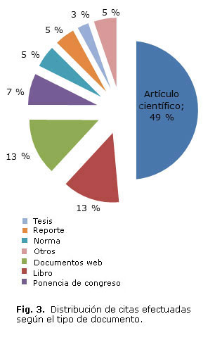 Tipo de documentos citados: las citas que los autores han hecho en sus trabajos acumulan un total de 947. Se destacan como tipo de documentos más citados los artículos científicos (460); le siguen los libros (126), los documentos web (125) y las ponencias de congreso (69). En la figura 3 se observa la distribución de estas citas según la tipología documental. Los documentos web (trabajos no arbitrados, publicaciones en sitios web) y los libros ocupan el mismo lugar en cifra, mientras que de las ponencias en congreso son más citados el IFLA General Conference & Council, la tercera fuente más citada con una frecuencia de 25 veces, dato que lo ubicaría en un tercer puesto después de las revistas ACIMED y Anales de Documentación. El otro congreso más citado es precisamente el cubano Congreso Internacional de Información, conocido como los INFO. Es detectable el cierto número de citas hechas a normas, pues ellas instituyen los principios básicos para la ALFIN, y como ejemplo de las citadas se encuentran las dictaminadas por la ALA/ACRL (4,43 %), CAUL (0,52 %) y SCONUL (0,37 %). Respecto a los años de las citas hechas, solo un 21,2 % corresponde al período anterior al año 2000 (abarca desde 1930 hasta 1999), lo que demuestra que se han estado consultando obras de gran actualidad.