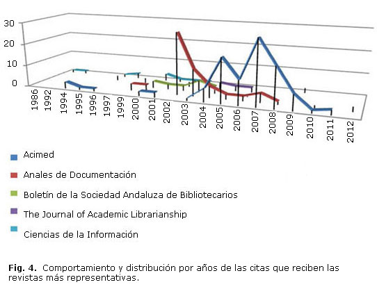 Revistas más citadas: se distingue que de las revistas más citadas, ACIMED ocupa un primer puesto con 105 citas. Seguidamente se encuentran las españolas Anales de Documentación (63 citas) y Boletín de la Asociación Andaluza de Bibliotecarios (16 citas); mientras que las dos últimas posiciones, según la figura 4, la ocupan The Journal of Academic Librarianship (13 citas) y Ciencias de la Información (13 citas). También es mostrada la relación de citas hechas a estas revistas y su distribución por años. Los años 2007 y 2008 son los más representativos para ACIMED; mientras para Anales de Documentación son el 2002 y el 2003. Se destacan estas dos por ser las que mayor curso de citación han mantenido.