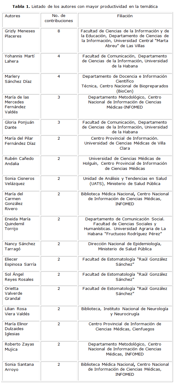 Productividad autoral: para la representación de los autores más productivos se tuvieron en cuenta aquellos que habían publicado dos o más de dos artículos, asumiendo como condicionante que la ALFIN es una de las reducidas líneas dentro del campo de la BCI, y considerando además que este estudio se limita a un contexto muy específico, el de la producción científica cubana. La tabla 1 muestra un total de 18 autores, donde Grizly Meneses Placeres, Yohannis Martí Lahera y Marlery Sánchez Díaz figuran como las más prolíficas. Aquí se refleja el 70,5 % de todas las contribuciones identificadas. Por otro lado, desde la perspectiva de la afiliación autoral, un 50 % forma parte del sector de la educación superior, donde se destacan centros universitarios propios del área de la salud que, junto a otros, representan el 78 %.