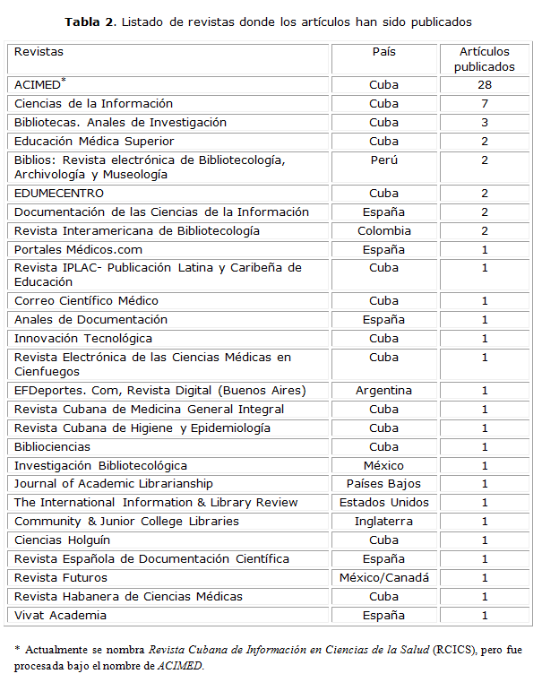 Productividad por revistas: las revistas científicas donde se encuentran distribuidos todos los trabajos suman un total de 27. A través de la tabla 2 se distinguen como las de mayor productividad las tres revistas cubanas cuya línea temática principal es la BCI. Estas son: ACIMED (41,7 %), Ciencias de la Información (10,4 %) y Bibliotecas. Anales de investigación (4,4 %).