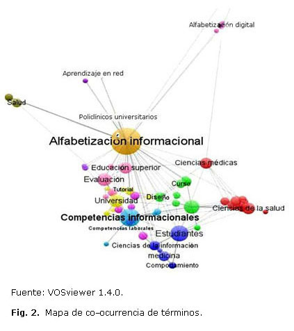 Por otro lado, el análisis de co-ocurrencia de términos develó el abordaje de cuatro líneas temáticas principales: 1) la alfabetización informacional en las ciencias médicas y de la salud, 2) las competencias informacionales en estudiantes universitarios, 3) la evaluación de la alfabetización informacional y 4) el diseño de programas de alfabetización informacional. Sobre la primera línea de investigación es muy evidente que la ALFIN en Cuba se relacione con el dominio de la medicina y la salud, ya que gran parte de la filiación de los autores son instituciones de este sector, y la mayoría de las temáticas abordadas se han producido desde este contexto. Esa condicionante también ha incidido en que muchos de los artículos estén publicados en revistas del área de la salud.