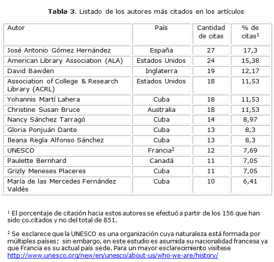 Contrariamente a la productividad de los autores nacionales, estos no tienden a ser tan citados, ya que solo un 46,15 % son cubanos. Se aprecia que es muy diversa la procedencia de los autores internacionales. Relativo a los nacionales hay algunos que no poseen tanta productividad, pero sí han recibido muchas citas, y viceversa. También han sido muy peculiares las citaciones a autores corporativos como la ALA, la ACRL y la UNESCO.