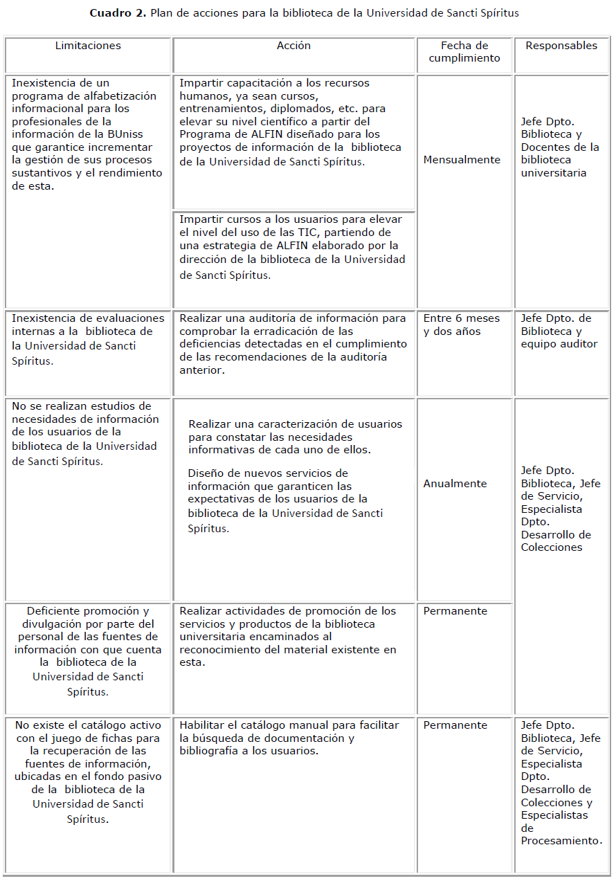 A partir del resultado del análisis de la encuesta aplicada a los recursos humanos de la BU, se hizo necesario desarrollar algunas acciones con vista a mejorar las limitaciones propuestas por ellos mismos y que fueron plasmadas en el plan de acción elaborado en el informe final de la auditoría de información: superación y capacitación a los profesionales de la información, evaluación de la calidad de los servicios a través de auditorías de seguimiento, estudio de necesidades de usuarios para conocer sus necesidades informativas, promoción y divulgación por parte del personal de las fuentes de información con que cuenta la biblioteca, habilitación de un catálogo manual, etcétera. En el cuadro 2 se refleja un plan de acción como respuesta a las limitaciones detectadas por los autores a partir del análisis de los resultados obtenidos de las técnicas utilizadas.