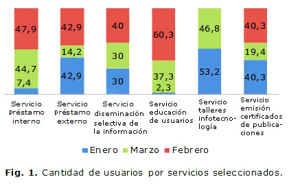 Los recursos humanos de que dispone la BU son: 12 trabajadores, de los cuales 9 (75 %) son graduados universitarios y 3 (25 %) son técnicos medio. En el primer trimestre del año 2014 hubo un total de 544 usuarios beneficiados con los seis servicios de información seleccionados para este estudio. Estos servicios fueron afectados por diversos motivos, lo cual ha hecho que exista una inestabilidad en estos, y la frecuencia de visitas disminuyó. En la figura 1 se muestra la cantidad de usuarios atendidos en el período de tiempo antes definido, según los servicios seleccionados para este estudio.