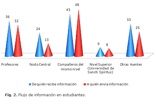 En la encuesta aplicada a los estudiantes, el 75 % refirió estar muy insatisfecho con la información sobre los servicios ofrecidos en la biblioteca. El 92 % respondió que se sentía muy insatisfecho con las comodidades del local (climatización, asientos disponibles, iluminación, ruido). El 85 % expresó que se sentía insatisfecho con el personal de servicio en las respuestas a sus requerimientos. La figura 2 muestra el resultado ante la pregunta a los estudiantes, relacionada con el flujo de información, donde prevalece el flujo horizontal entre compañeros del mismo nivel. En segundo lugar, desde y hacia los profesores, le siguen otras fuentes. Se puede observar que el flujo de información que se recibe o envía a los bibliotecarios es muy bajo, lo cual está en correspondencia con las incidencias que afronta el personal bibliotecario y los propios profesores en sus respuestas.