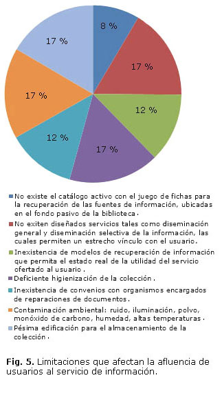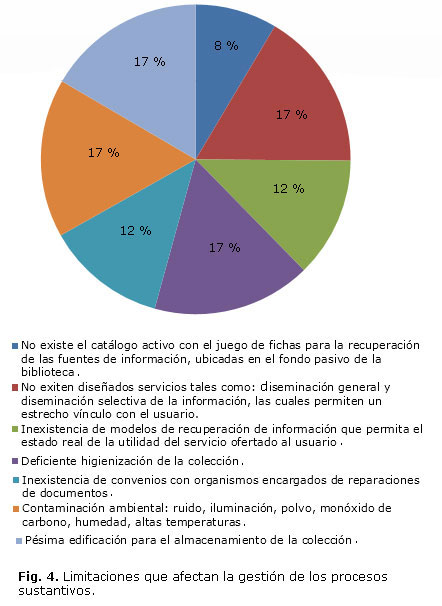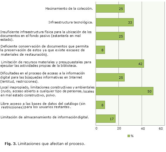 Una de las preguntas estuvo dirigida a detectar limitaciones de infraestructura física, material o tecnológica que los encuestados creían que afectaban la gestión de los procesos sustantivos de la biblioteca y se pudo constatar que el 50 % coincidía en una misma limitación. Además, fue recurrente en el análisis general de los resultados que el local era inapropiado para realizar los servicios bibliotecarios, ya que afrontaba malas condiciones constructivas y medioambientales, lo cual incidía en la concentración para realizar diversas actividades (Fig. 4).