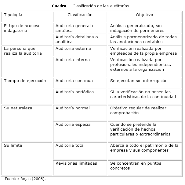 Las auditorías sirven de herramientas para la evaluación de la gestión de información en las organizaciones y de las necesidades informativas de sus usuarios o clientes, ya que constituyen uno de los pasos previos para instaurar un sistema de gestión de información dentro de estas.13 La auditoría de información es heredada de otras ciencias de orden económico y financiero, principalmente al adquirir características muy peculiares a una serie de actividades humanas, y han pasado a ser patrimonio de estas. Las auditorías se pueden clasificar según indica el cuadro 1.14-15