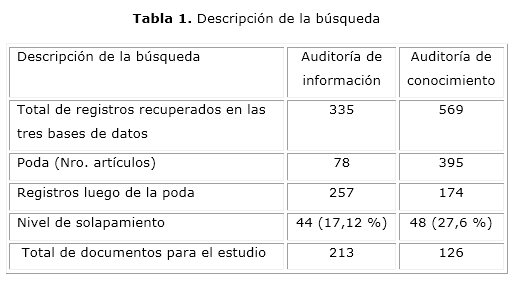 Como estrategia de búsqueda se utilizó el equivalente en inglés de los términos AI (information audit or information auditing) y AC (knowledge audit or knowledge auditing) y se procedió a la búsqueda en todas las categorías por los tipos de documentos (tabla 1).