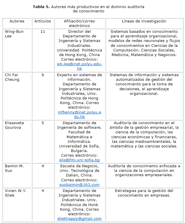 En todo el análisis se pudo constatar que para este dominio los autores prefieren publicar en solitario, los que representan el 85 %. Los que más cantidad de trabajos aportan son Wing-Bun Lee, Chi Fai Cheung, Elissaveta Gourova y Baimin M. Suo, quienes proceden principalmente del sector empresarial y académico. Los cinco países líderes en las investigaciones sobre esta temática son China, Reino Unido, Estados Unidos, Bulgaria y Australia y las revisdtas más productivas fueron VINE, Lecture Notes in Computer Science, Journal of Knowledge Management, Industrial Management and Data Systems. En las publicaciones sobre AC se observa una tendencia al incremento del número de publicaciones en los próximos cinco años y a diferencia de las AI, se han orientado en los últimos diez años hacia las áreas temáticas de las ciencias de la computación y las ciencias empresariales.