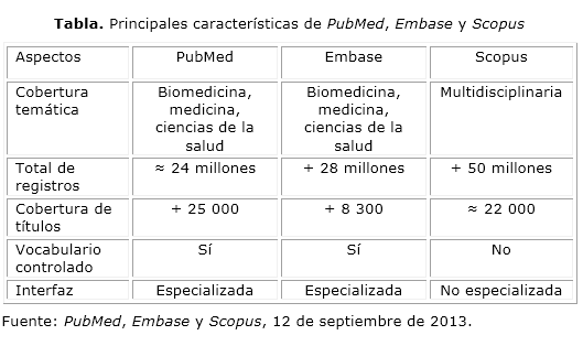 La búsqueda y recuperación de información es una etapa fundamental del quehacer científico. La búsqueda de información en bases de datos bibliográficas internacionales prominentes es una práctica común en este contexto. Pero, antes de realizar una búsqueda de información en una de estas, es necesario conocer qué contienen y cuán similares y diferentes son entre ellas, sus facilidades, herramientas, alcance y tipología documental procesada, entre otros aspectos. Obtener esta información es ciertamente difícil, porque existen múltiples fuentes de información con datos dispersos, parciales y faltos de exactitud. Por eso, se realizó una profunda investigación documental y se consultó a los expertos que laboran en el desarrollo de bases de datos como PubMed-Medline, Embase y Scopus, con vistas a ofrecer a los profesionales de la salud del país, y en especial a los investigadores, una caracterización precisa de ellas.