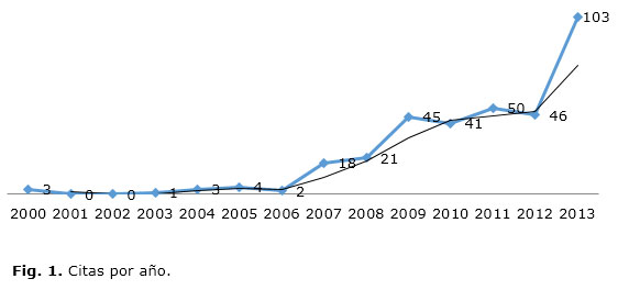 Las citas identificadas suman un total de 337. Estas han evolucionado de forma ascendente (Fig. 1); aunque en el período 2000-2006 se muestran bajos índices de impacto, para un promedio de 1,85 citas por año. A partir del 2007 este promedio aumenta a un 46,85 por año. Nótese los niveles mantenidos desde el 2009 hasta el 2012. El año 2013 es el más relevante. Es importante destacar que este rango 2007-2013 concentra el 96,14 % de las citas identificadas.