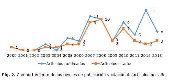 Del total de los 67 artículos fuente, el 65,67 % (44) ha recibido al menos una cita. A través de la figura 2 se aprecia el constante equilibrio en el comportamiento dado entre el número de artículos publicados y el número de estos que han sido citados. Solo se percibe un declive en la citación durante los últimos años (2012-2013), lo cual pudiera estar dado por la inmediatez con la que éstas se efectúan.