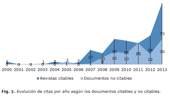 El comportamiento de citas hechas por revistas ha sido progresivamente superior que el de los documentos no citables (Fig. 3). En el año 2007, cuando el impacto comenzó a acrecentarse, las citas ejecutadas provenían mayormente de revistas científicas, patrón que se mantuvo hasta el año 2013; con la diferencia del año 2011 en el que se produjo cierto equilibrio con los documentos no citables.