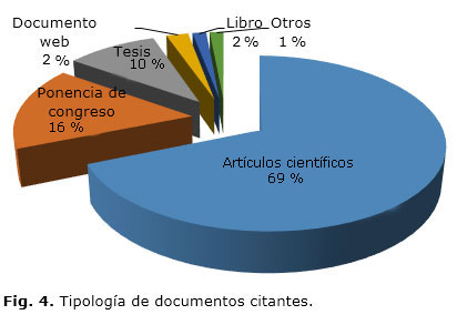 Un acercamiento más preciso a la tipología documental citante devela que los artículos científicos ocupan más del 50 % de las citas (Fig. 4), mientras que de las ponencias de congreso se destacan las correspondientes al área de la salud, tales como: la Jornada Virtual de Ciencias de la Información en Salud (15, Cuba), la Jornada de Educación Médica (5, Cuba), el EDUMED (4, México), el Congreso Virtual de Ciencias Morfológicas (3, Cuba) y el Congreso Virtual Hispanoamericano de Anatomía Patológica (2, España).