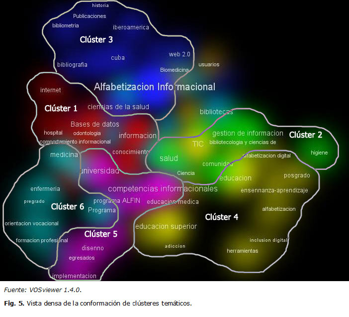 En el clúster 4, es educación superior el de mayor intensidad, y sus amplias relaciones son dadas con alfabetización informacional (fr: 7), evaluación (fr: 5), educación médica (fr: 3), y enseñanza (fr: 3). Aquí es muy distintiva la presencia de términos como: TIC, educación, docentes, y sociedad de la información. El clúster 5 refleja a competencias informacionales como ítem más intenso, el cual adquiere fuertes asociaciones con alfabetización informacional (fr: 5), universidad (fr: 5), información (fr: 5), profesional de la información (fr: 4), educación superior (fr: 4), evaluación (fr: 4), formación (fr: 4) y profesional de la salud (fr: 4).