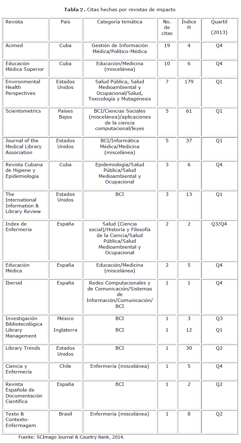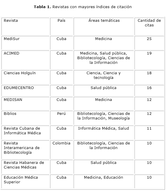 La tabla 1 muestra una lista de las revistas que mayor cantidad de citas han efectuado. Se resaltan en los primeros planos títulos cubanos como MediSur (7,41 %), ACIMED (actualmente Revista Cubana de Información en Ciencias de la Salud, 5,63 %), Ciencias Holguín (5,34 %) y EDUMECENTRO (4,74 %).