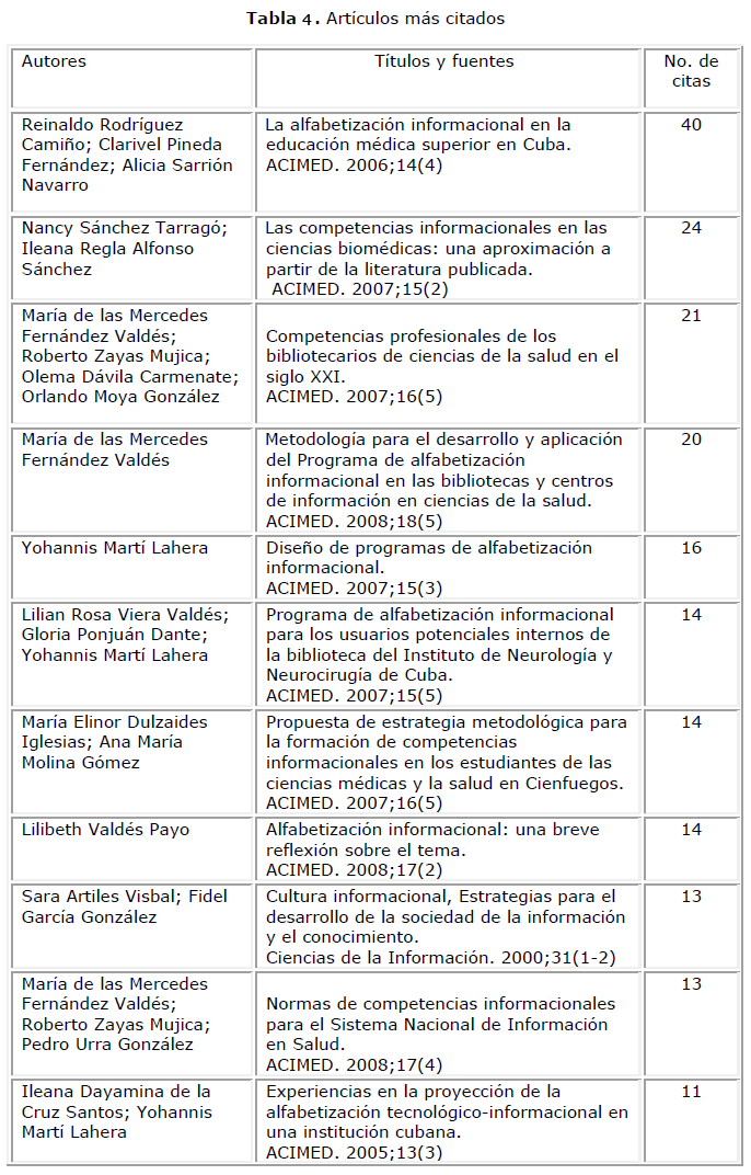 Los artículos más citados reflejan que la mayor fuente de publicación han sido las revistas cubanas, en especial ACIMED (76,92 %) y Ciencias de la Información (15,38 %). En estos trabajos está concentrado el 62,01 % del total de citas detectadas (tabla 4). Por otro lado, gran parte de estos artículos se han publicado durante los años 2006-2008, período en el que hubo un aumento en los niveles de citación.