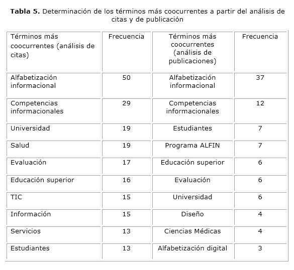 Un análisis comparativo efectuado con los términos más coocurrentes de los trabajos citados6 y los citantes, evidencia que ALFIN y las competencias informacionales son los tópicos más tratados. En la tabla 5 se muestran, para cada resultado, las diez categorías más abordadas. Estas son coincidentes en más del 50%. Nótese que la frecuencia en los términos resultantes del análisis de publicaciones es menor, ya que este análisis se realizó con 67 documentos; sin embargo, en el análisis de citas los resultados temáticos son similares, a pesar de que la cifra de trabajos analizados ha sido superior (337).