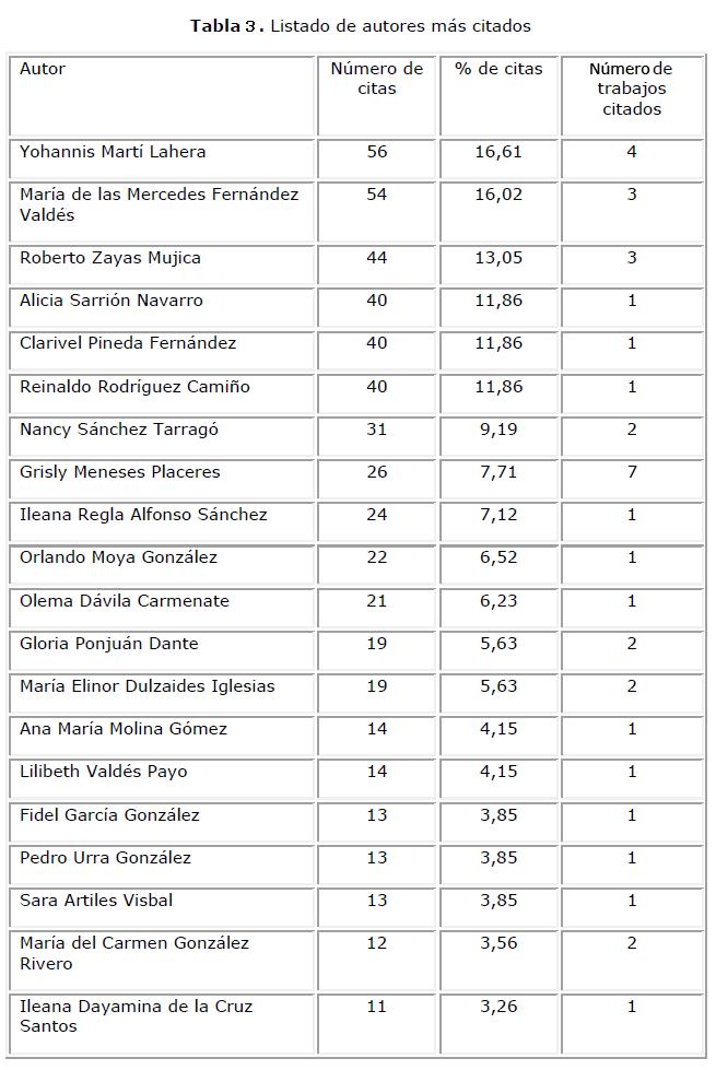 Nótese que de los títulos mostrados, hay un predominio de las estadounidenses (4; 23,52 %) y las españolas (4; 23,52 %) en lugar de las propias cubanas (17,64 %), un patrón que no se corresponde con lo reflejado en la tabla 1. Es de gran distinción resaltar que la mayoría de estos títulos es de cuarto y primer quartil (41,17 % y 29,41 % respectivamente). Quedan en menor plano los de tercer (17.64%) y segundo (11.76%) quartilb.Han sido 20 los autores que han alcanzado una cifra superior a las 10 citas (tabla 3). Como más representativos figuran Yohannis Martí Lahera y María de las Mercedes Fernández Valdés, con más de 50 citas en cada caso. Es apreciable que el número de los trabajos citados es muy bajo, para un promedio de 1,8.