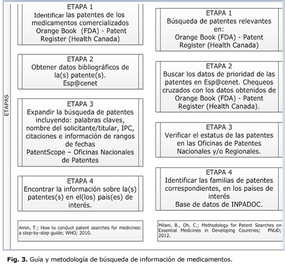 Analizando las diferentes etapas reportadas en ambos documentos (Fig. 3) se puede observar su semejanza. Es importante señalar que la génesis metodológica de ambas metodología sustenta fundamentalmente los problemas que presenta la búsqueda de patentes de medicamentos en forma general, específicamente en los países en desarrollo. Se observa que en ambas metodologías se dedica especial atención a la identificación de las patentes de medicamentos, mediante la búsqueda por compuestos químicos que pueden ser realizadas utilizando diversos métodos.