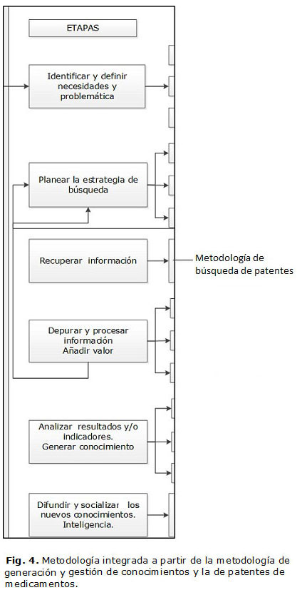 La literatura reporta diferentes metodologías31-38 o normas, relacionadas con la vigilancia tecnológica, la inteligencia (tecnológica o competitiva)39,40 y la generación de conocimientos,41 que serán de utilidad al combinarse con elementos de las metodologías de búsqueda de documentos de patentes de medicamentos descritas en este estudio.