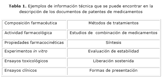 En el caso de las patentes farmacéuticas, la información técnica, es de gran utilidad en los diferentes pasos del ciclo de vida de un proyecto de I+D+i. Esto se relaciona con la información que contienen y que puede incluir, entre otros, un procedimiento para la obtención de un principio activo, de un compuesto farmacéutico, así como las diferentes formas farmacéuticas (tabla 1). Esta información es de suma importancia para los investigadores y productores de medicamentos genéricos.