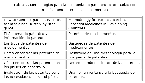 Las metodologías How to Conduct Patent Searches for Medicines: a Step-By-Step Guide28 y Methodology for Patent Searches on Essential Medicines in Developing Countries,29 son de gran utilidad para la búsqueda de patentes; de aquí la importancia de su uso por profesionales vinculados al campo de los medicamentos genéricos. No obstante, no se puede considerar que con su sola aplicación se brinda una respuesta integral a las necesidades de los usuarios.