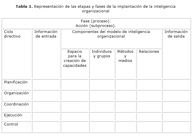 En la tabla 1 se representan las fases de la implantación de la IO, que se corresponden con las ocho etapas del ciclo ampliado de información.3 Cada fase se considera como un proceso, y cada acción como un subproceso; y se tratan con la visión de las partes que conforman el ciclo directivo. De esta manera, los individuos y grupos que participan, se relacionan, y usan métodos y medios para generar nuevas informaciones, conocimientos y capacidades en los diferentes espacios que existen en la organización, lo hacen con el enfoque de proceso; es decir, incrementan el valor de las informaciones de entrada y así generan salidas necesarias para las etapas siguientes del ciclo directivo, en el contexto de la acción que se describe, que forma parte de la fase que se ejecuta en un momento dado de la gerencia y la gestión de la ciencia, la tecnología y el medio ambiente en La Habana.