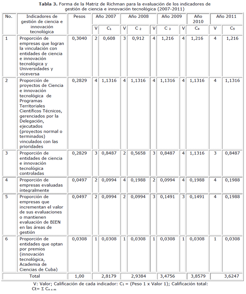 La calificación por años de los indicadores de gestión de ciencia e innovación tecnológica (tabla 3) revela, una tendencia a la mejora o estabilidad en los resultados. La proporción de empresas que logran la vinculación con ECITs y universidades, y viceversa, en los últimos tres años alcanza la calificación de muy buena, lo que indica que más del 90 % de las empresas priorizadas, como resultado, logra desarrollar acciones de introducción de resultados, servicios científico-técnicos, capacitación, asesorías y otras. Las empresas priorizadas por su aporte a la economía y la sociedad de la provincia y del país, como promedio, ascienden anualmente a 62 y no varían en su mayoría. En ellas se evalúan cinco áreas de gestión: innovación, ambiental, calidad, propiedad industrial e información. En los dos últimos años alcanzaron la calificación de 4, lo que significa que más del 85 % de ellas incrementan el valor de sus evaluaciones o las mantienen, como resultado de las acciones de interfaz desarrolladas por la Delegación.