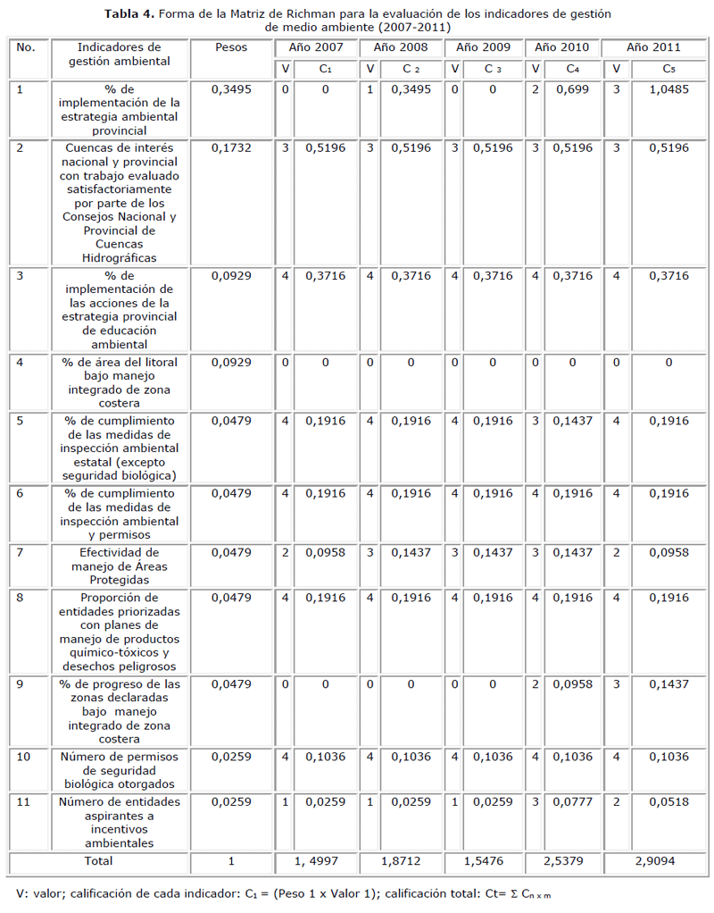 En la gestión ambiental, se atribuyó mayor predominancia a la implantación de la estrategia ambiental provincial (EAP) por ser el instrumento mediante el cual se aplica la política y la gestión ambiental cubana en el territorio. A partir de la información existente sobre el comportamiento anual de cada uno de los indicadores, los expertos asignaron, por consenso, el valor correspondiente a cada uno de los indicadores y se obtuvo su calificación anual, para un período de cinco años (2007-2011), así como la calificación total de cada uno de ellos.