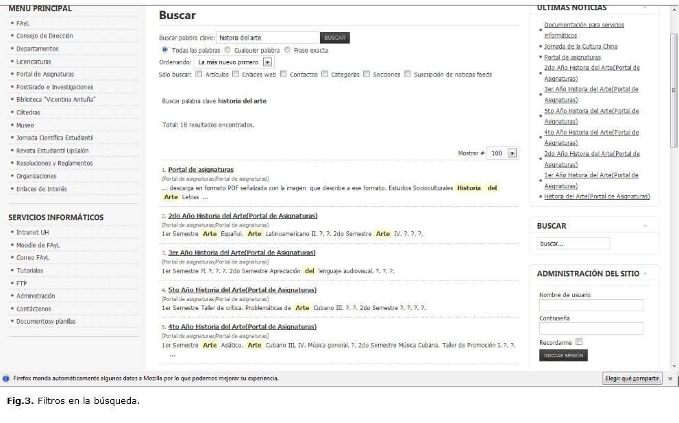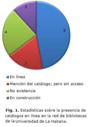 De las 17 facultades analizadas, solo poseen catálogos en línea 8. En otras 3 se puede apreciar la mención del catálogo dentro de su página web, pero no se puede acceder a él desde la red, solo dentro de los límites de la propia institución; en 4 no se puede constatar la existencia de catálogos en línea y 2 presentan los sitios web de sus instituciones en construcción (Fig. 1).