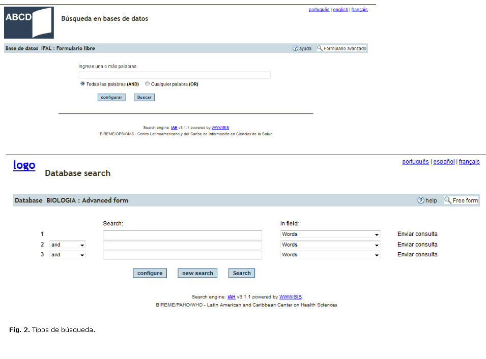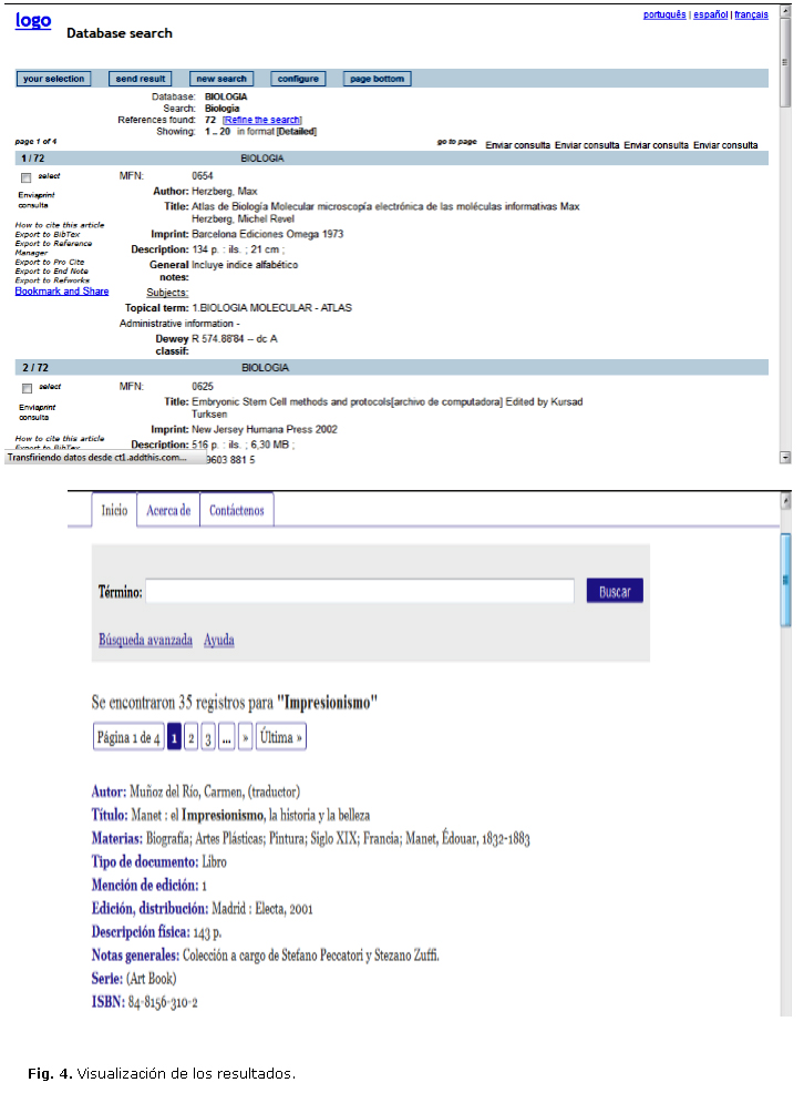 En cuanto a las posibilidades de llegar a interactuar con el catálogo, es decir, a la cantidad de clic necesarios para llegar al catálogo, solo en 1 de los 8 casos que cuentan con los catálogos se puede llegar con 2 clic; en 3 casos con 3 clic, y el resto entre 4 y 5 clic, lo que hace difícil al usuario llegar a acceder a los servicios que prestan dichos catálogos. De acuerdo con el software que utilizan para la creación de dichos catálogos, en la mayoría de los casos (6 de 8) se plantea que utilizan el ABCD*, apoyado en el Winisis (Fig. 2).