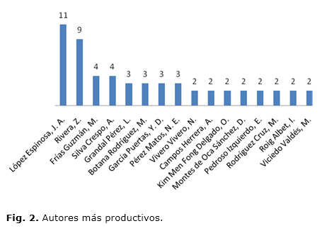 La producción en la temática fue resultado de las investigaciones de 36 autores; 16 de ellos con más de 2 trabajos y 20 con solo un trabajo. López Espinosa y Rivera constituyeron los autores más representativos dentro de la muestra analizada. En el estudio de Lorenzo,8 se constata este resultado. Ambos se encuentran dentro de los ocho autores más productivos de la revista en el período 2000-2007 (Fig. 2).