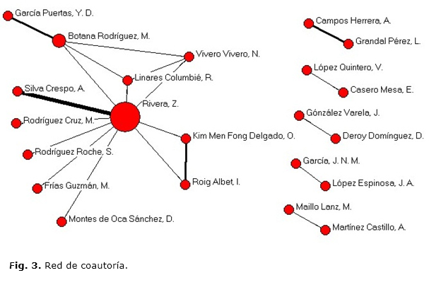 La figura 3 muestra las relaciones de coautoría que se manifiestan en las fuentes objeto de estudio. La intensidad de las líneas representa las relaciones de colaboración que se instauraron. Fue usual que autores, tutores y consultores de los trabajos de diploma se integraran en la publicación de los resultados científicos. Este proceder incidió en la significativa presencia de sus firmas en la revista que se analiza, y constituyó una de las principales fuentes de comunicación. El nodo más distintivo corresponde a Rivera como autora más productiva. Este es un resultado esperado a partir de los indicadores primarios analizados. La experiencia de Botana Rodríguez y sus vínculos con el ámbito académico, a partir de su condición de profesora adjunta del Departamento de Bibliotecología y Ciencia de la Información de la Facultad de Comunicación de la Universidad de La Habana,resaltaron su presencia en la red de coautoría.