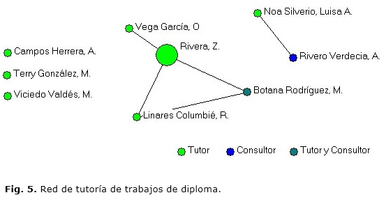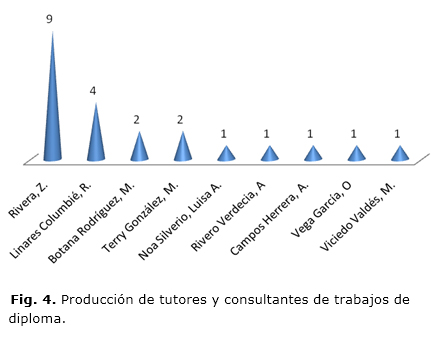 Los tutores y consultantes de los trabajos de diploma se representan en la figura 4. La tutoría la ejercieron 8 personas, dentro de las que se excluye Rivero Verdecia en su única condición de consultante. De las dos contribuciones de Botana Rodríguez una corresponde a su rol de tutora y la otra de consultante. Solo el 37,5 % son profesores a tiempo completo del Departamento: Rivera, Linares Columbié y Campos Herrera.